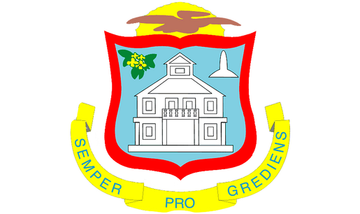 Sint Maarten's coat of arms is made up of a shield with a rising sun above, and the island motto is displayed on a ribbon below. The Sint Maarten courthouse is displayed in the middle of the shield, with an orange-yellow sage (the national flower) to the left, and the border monument to the right. Flying above the shield, in front of the sun, is a brown pelican (which is the national bird).